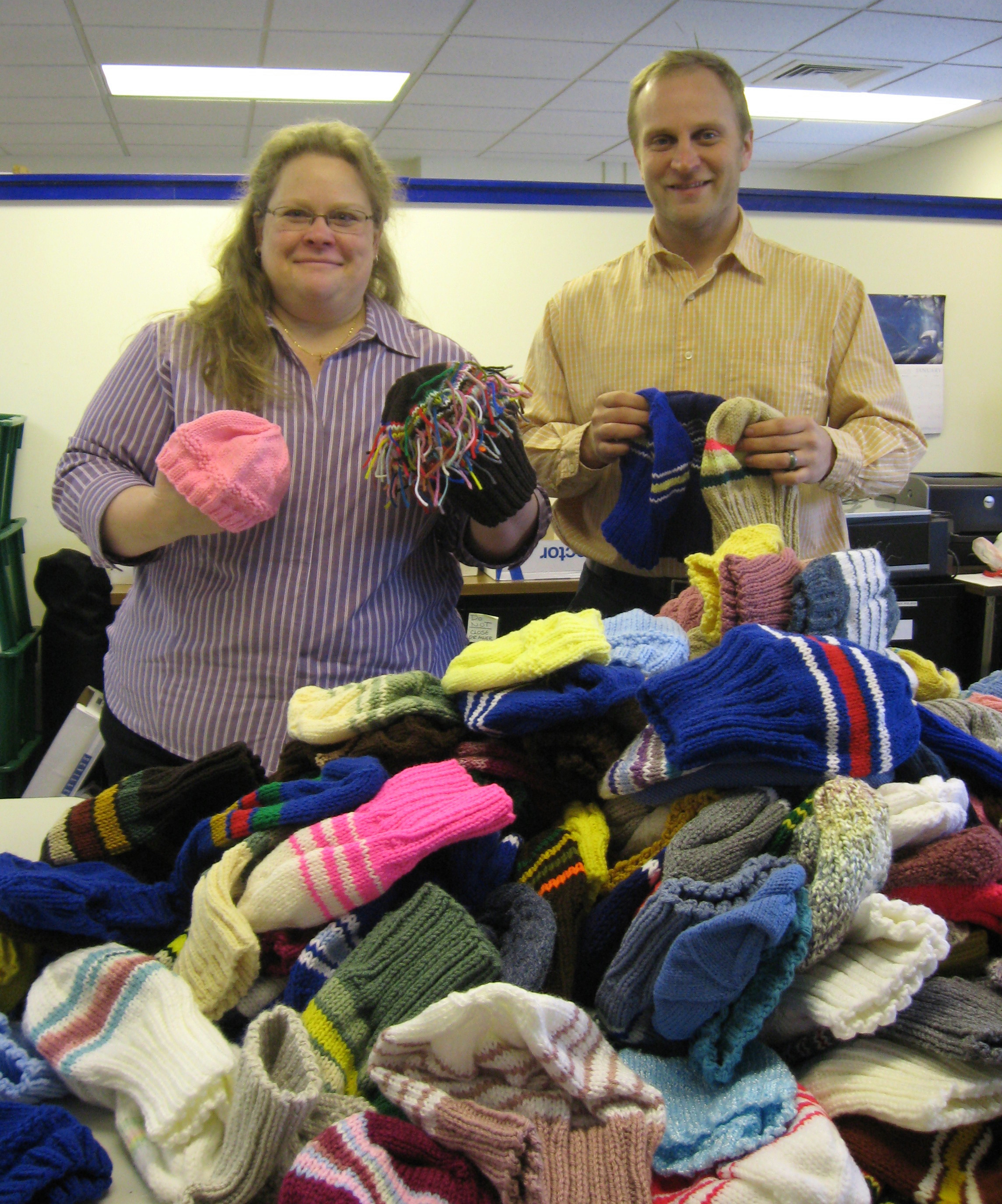 Lisa Luebke and Ben Crockett, of Char-Em United Way, with 300 hand-knitted kids hats that have been donated for Project Connect. The event coordinators are seeking a wide range of donated items and funds to purchase them.